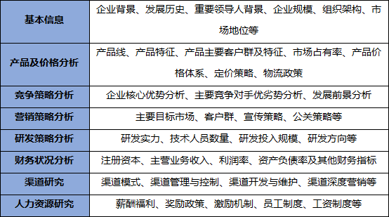 競爭研究的根本目標是通過一切可獲得的信息來查清競爭對手的狀況,包括:產品及價格策略、渠道策略、營銷(銷售)策略、競爭策略、研發策略、財務狀況及人力資源等,發現其競爭弱勢點,幫助企業制定恰如其分的進攻戰略,擴大自己的市場份額;另外,對競爭對手最優勢的部分,需要制定回避策略,以免發生對企業的損害事件。